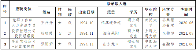 按照2020年8月28日發(fā)布的《2020年煙臺財金集團(tuán)面向“雙一流”和全球TOP200高校畢業(yè)生公開招聘簡章》相關(guān)規(guī)定,經(jīng)過簡歷收集、資格審查、初試、復(fù)試、集體決策等環(huán)節(jié),擬確定部分崗位錄取人選(詳見下表),現(xiàn)予以公示,公示期為5個工作日(11月10日至11月17日)。